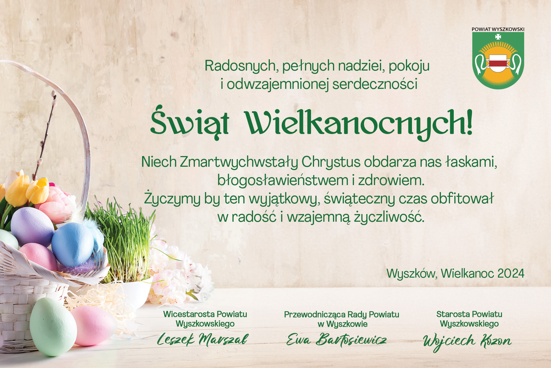 Radosnych, pełnych nadziei, pokoju i odwzajemnionej serdeczności Świąt Wielkanocnych! Niech Zmartwychwstały Chrystus obdarza nas łaskami, błogosławieństwem i zdrowiem. Życzymy by ten wyjątkowy, świąteczny czas obfitował w radość i wzajemną życzliwość.