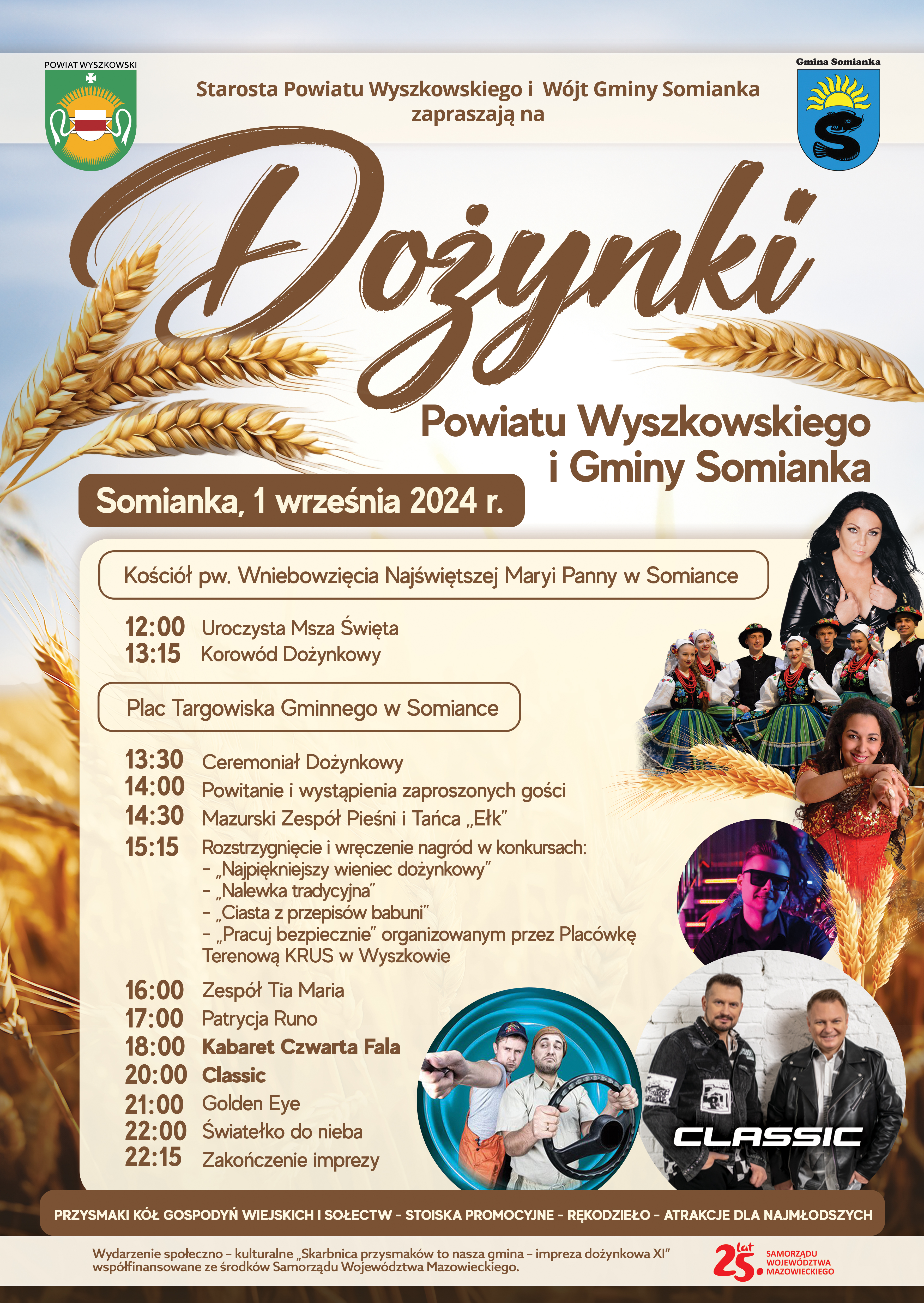 Starosta Powiatu Wyszkowskiego i Wójt Gminy Somianka zapraszają na Powiatowo-Gminne Dożynki! 1 września 2024 r. spotkajmy się w Somiance!