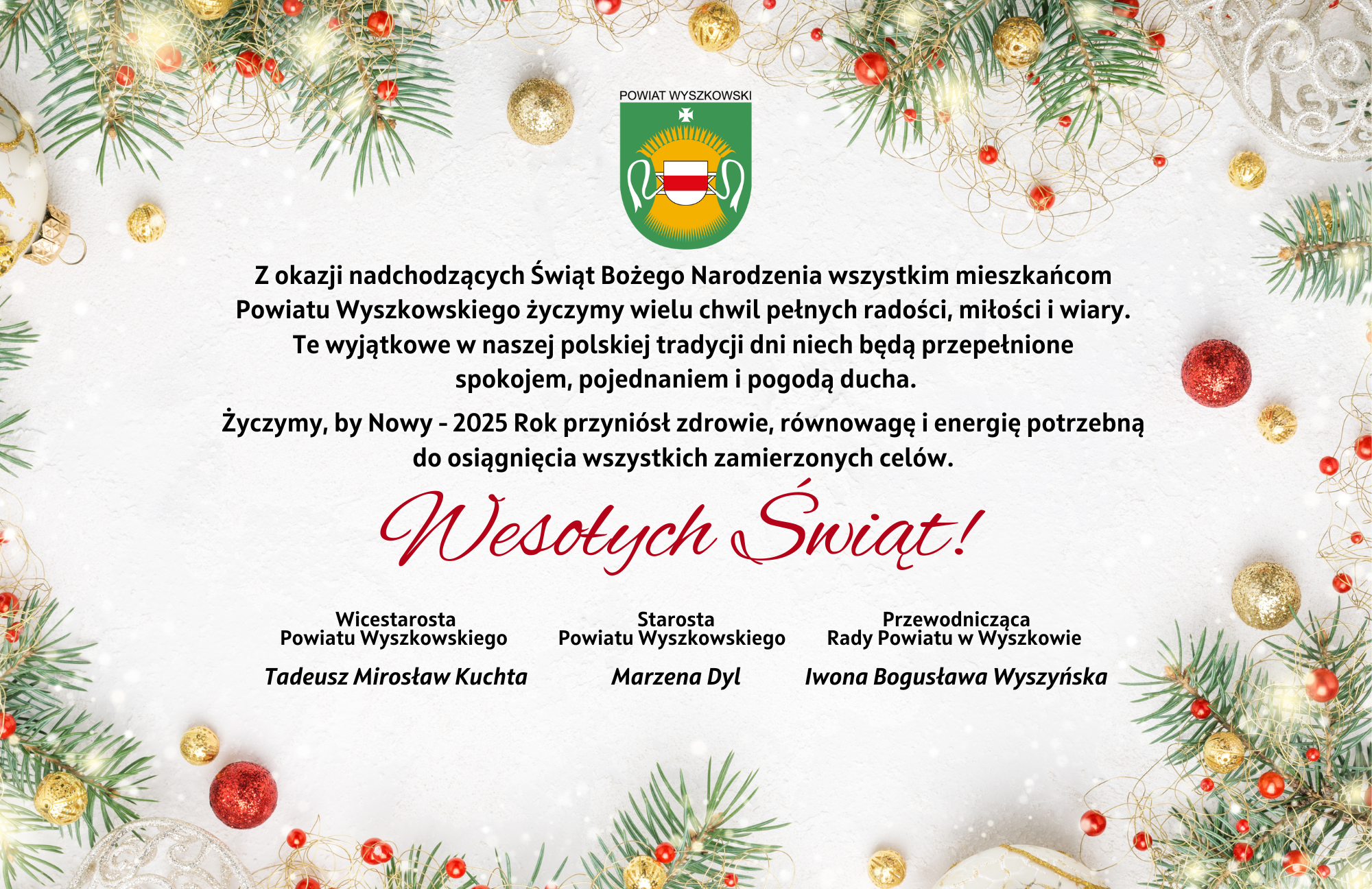 Z okazji nadchodzących Świąt Bożego Narodzenia wszystkim mieszkańcom Powiatu Wyszkowskiego życzymy wielu chwil pełnych radości, miłości i wiary. Te wyjątkowe w naszej polskiej tradycji dni niech będą przepełnione spokojem, pojednaniem i pogodą ducha.